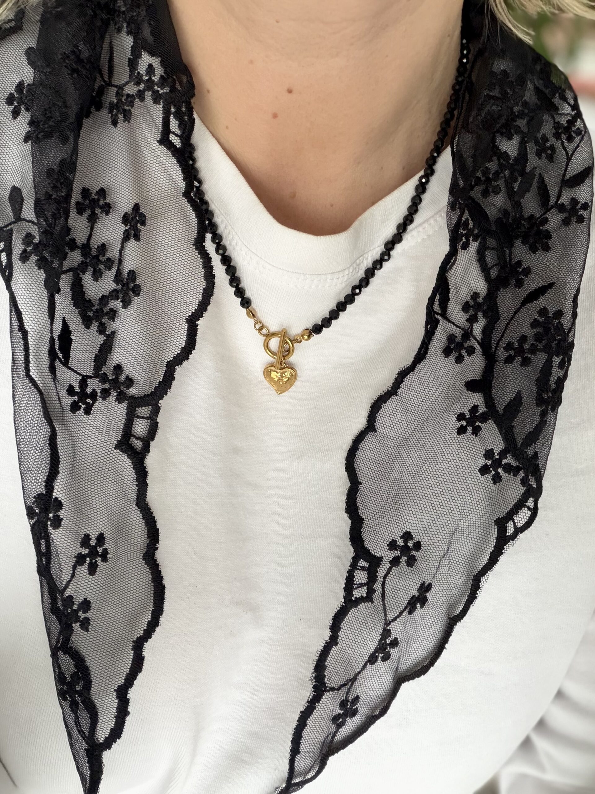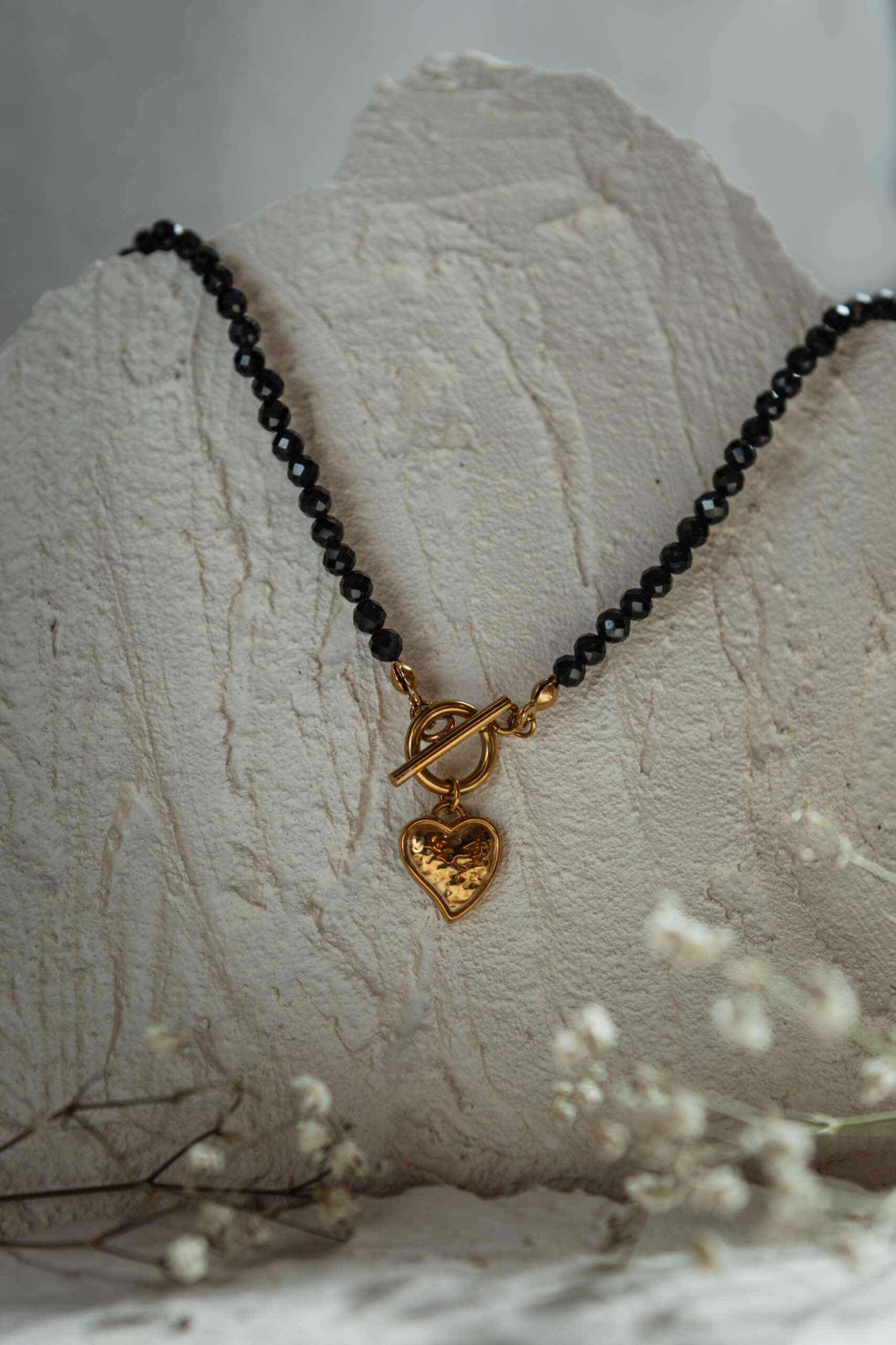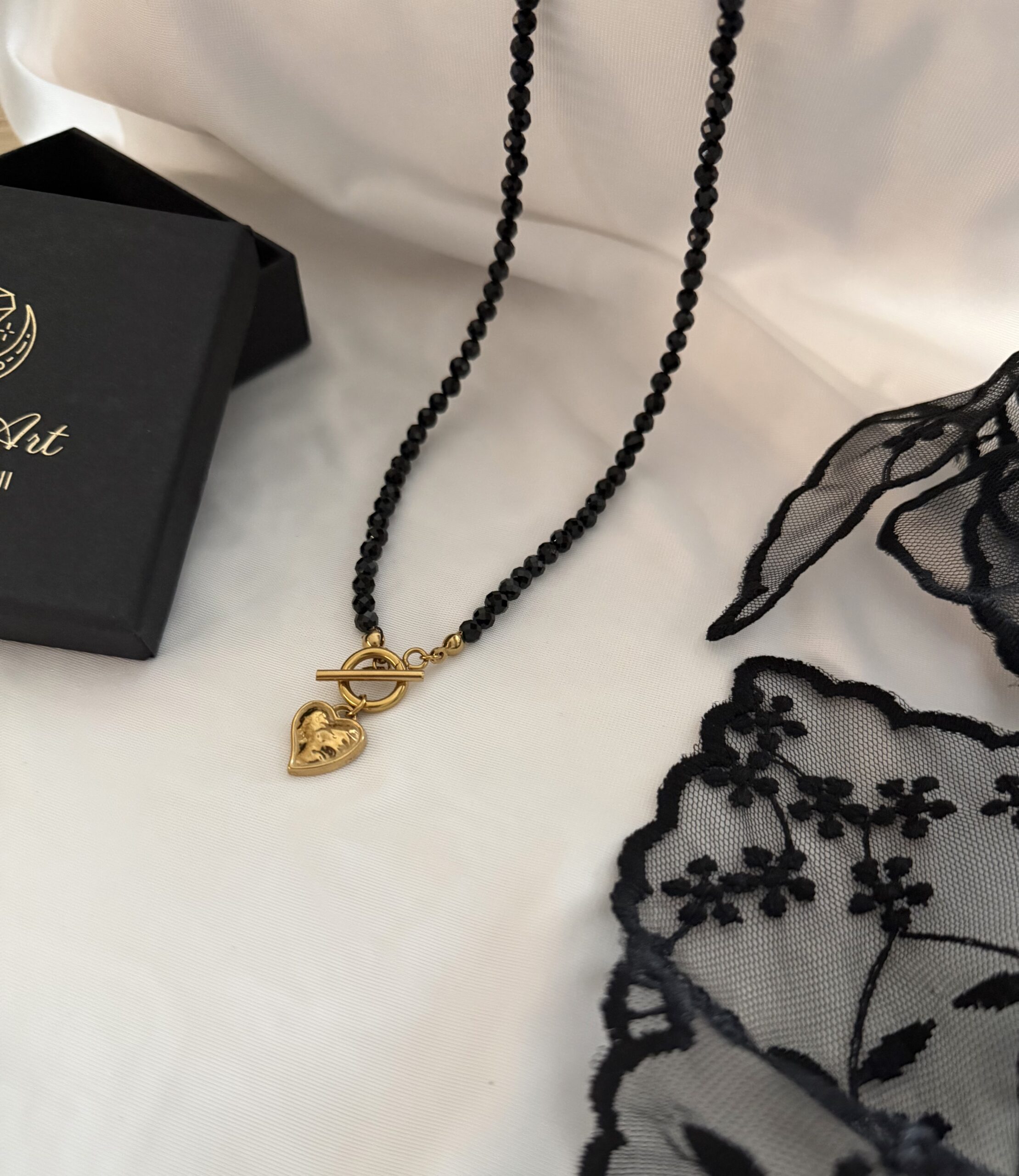 Naszyjnik wykonany jest z naturalnych kamieni czarnego turmalinu z zapięciem toggle oraz zawieszką w kształcie serduszka.
